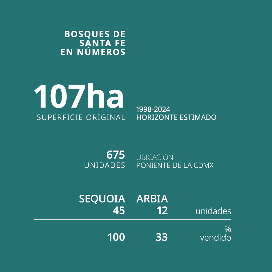 El enfoque del proyecto es ofrecer un desarrollo residencial seguro para vivir, en una ubicación estratégica por su proximidad con uno de los principales centros de negocios y comerciales de la Ciudad de México. Bosques de Santa Fe tiene una superficie total de aproximadamente 107 hectáreas, de las cuales, más del 30% son espacios verdes, que permiten a sus residentes vivir en una atmósfera rodeada de áreas naturales, además de contar con un campo de golf de 9 hoyos diseñado por Jack Nicklaus y una casa club que ofrece una amplia gama de actividades sociales y recreativas. Para complementar la oferta, dentro del desarrollo se tienen amenidades como gimnasio, alberca, canchas de futbol y tenis, entre otros.